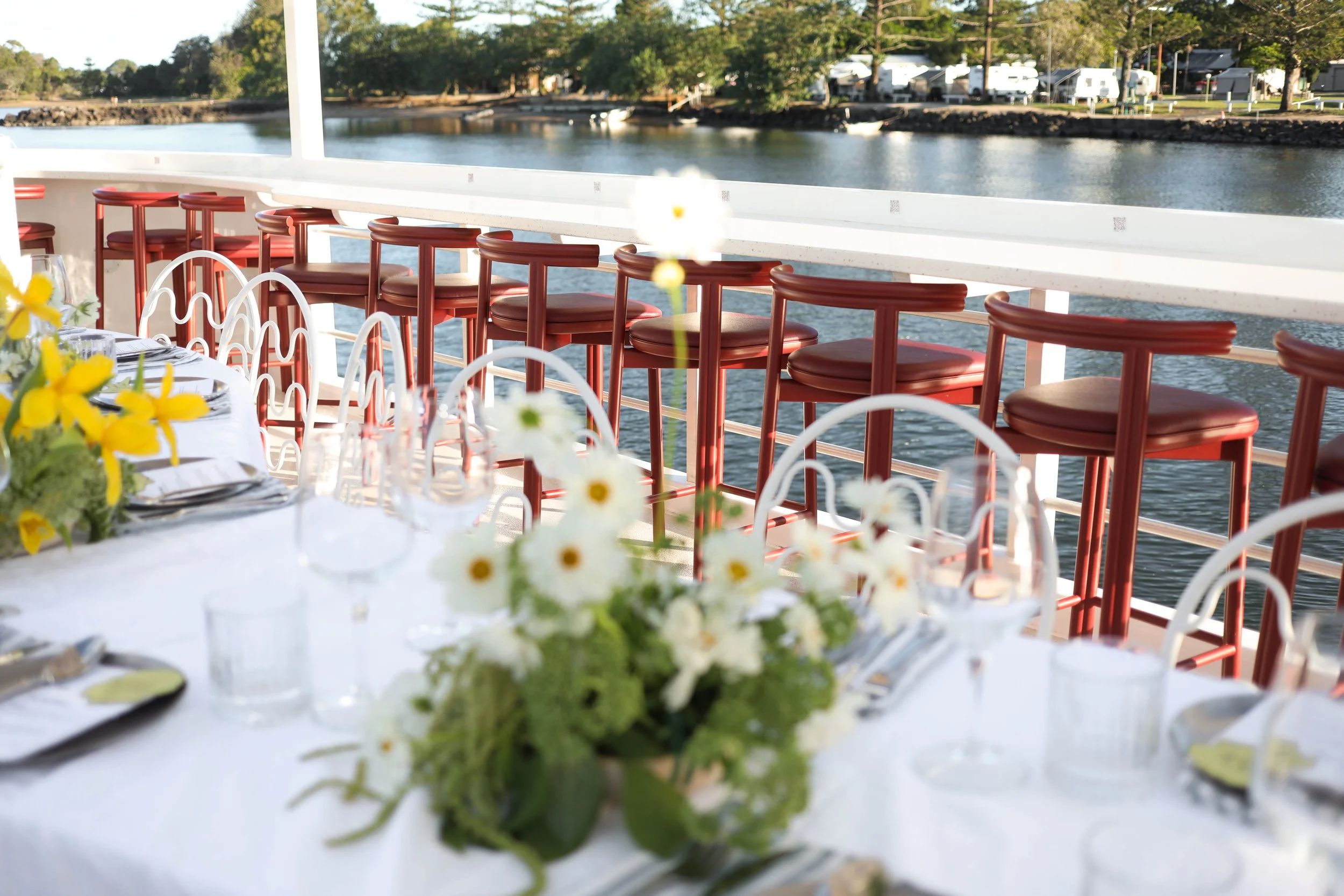M.V. Jasmine hosts unique custom-built furniture inspired by the River and designed for long-table seating on the upper deck, catering to celebrations over 30.